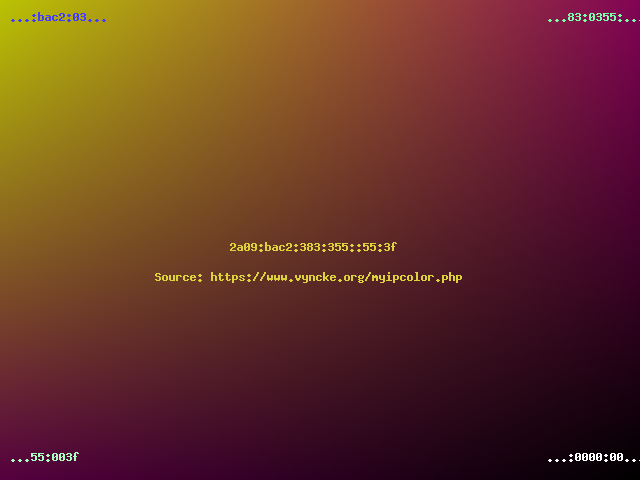 Had you selected a modern Internet Service Provider, then with your modern IPv6 address you would have seen a colorful picture... In general, the top half of the image will never change from the same network location (it is linked to your Internet Service Provider's prefix) but the bottom part can change daily (especially when using IPv6 privacy extensions).