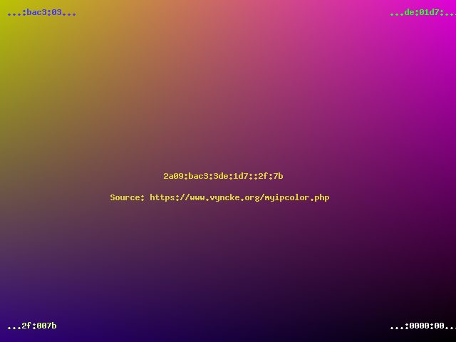Had you selected a modern Internet Service Provider, then with your modern IPv6 address you would have seen a colorful picture... In general, the top half of the image will never change from the same network location (it is linked to your Internet Service Provider's prefix) but the bottom part can change daily (especially when using IPv6 privacy extensions).