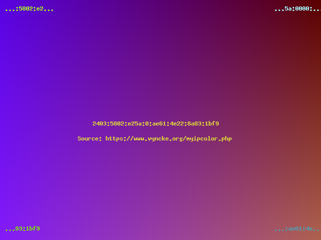 Had you selected a modern Internet Service Provider, then with your modern IPv6 address you would have seen a colorful picture... In general, the top half of the image will never change from the same network location (it is linked to your Internet Service Provider's prefix) but the bottom part can change daily (especially when using IPv6 privacy extensions).