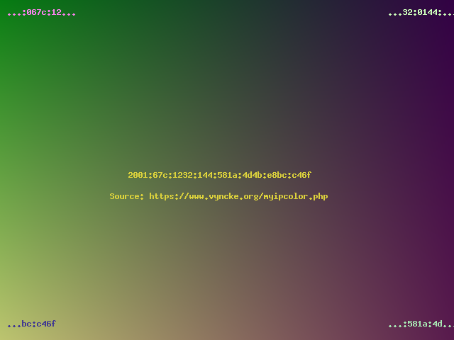 Had you selected a modern Internet Service Provider, then with your modern IPv6 address you would have seen a colorful picture... In general, the top half of the image will never change from the same network location (it is linked to your Internet Service Provider's prefix) but the bottom part can change daily (especially when using IPv6 privacy extensions).