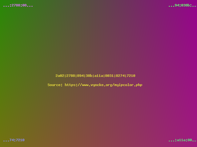 Had you selected a modern Internet Service Provider, then with your modern IPv6 address you would have seen a colorful picture... In general, the top half of the image will never change from the same network location (it is linked to your Internet Service Provider's prefix) but the bottom part can change daily (especially when using IPv6 privacy extensions).