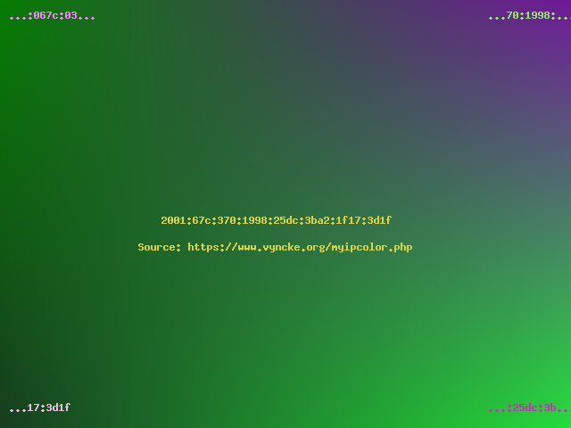 Had you selected a modern Internet Service Provider, then with your modern IPv6 address you would have seen a colorful picture... In general, the top half of the image will never change from the same network location (it is linked to your Internet Service Provider's prefix) but the bottom part can change daily (especially when using IPv6 privacy extensions).
