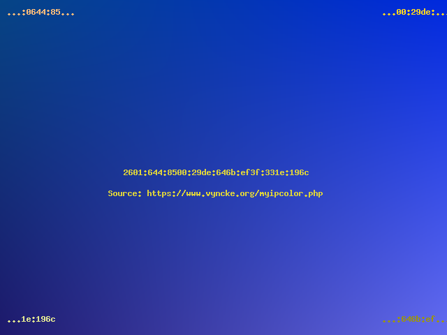Had you selected a modern Internet Service Provider, then with your modern IPv6 address you would have seen a colorful picture... In general, the top half of the image will never change from the same network location (it is linked to your Internet Service Provider's prefix) but the bottom part can change daily (especially when using IPv6 privacy extensions).