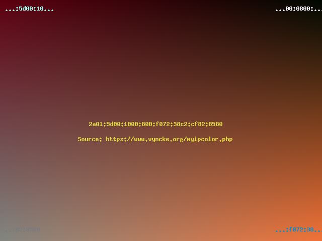 Had you selected a modern Internet Service Provider, then with your modern IPv6 address you would have seen a colorful picture... In general, the top half of the image will never change from the same network location (it is linked to your Internet Service Provider's prefix) but the bottom part can change daily (especially when using IPv6 privacy extensions).