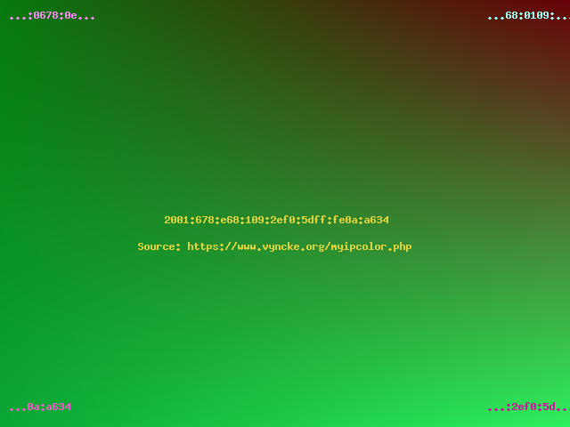 Had you selected a modern Internet Service Provider, then with your modern IPv6 address you would have seen a colorful picture... In general, the top half of the image will never change from the same network location (it is linked to your Internet Service Provider's prefix) but the bottom part can change daily (especially when using IPv6 privacy extensions).