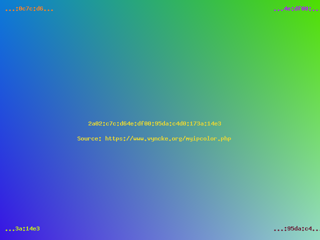Had you selected a modern Internet Service Provider, then with your modern IPv6 address you would have seen a colorful picture... In general, the top half of the image will never change from the same network location (it is linked to your Internet Service Provider's prefix) but the bottom part can change daily (especially when using IPv6 privacy extensions).