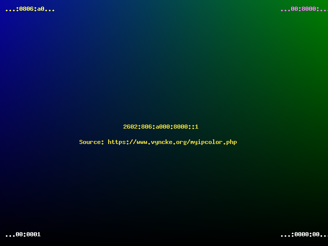Had you selected a modern Internet Service Provider, then with your modern IPv6 address you would have seen a colorful picture... In general, the top half of the image will never change from the same network location (it is linked to your Internet Service Provider's prefix) but the bottom part can change daily (especially when using IPv6 privacy extensions).