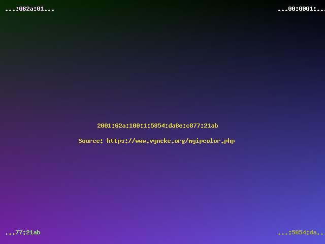 Had you selected a modern Internet Service Provider, then with your modern IPv6 address you would have seen a colorful picture... In general, the top half of the image will never change from the same network location (it is linked to your Internet Service Provider's prefix) but the bottom part can change daily (especially when using IPv6 privacy extensions).