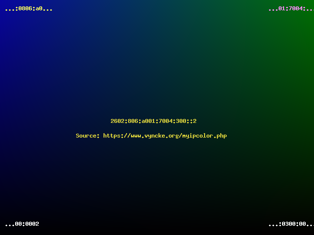 Had you selected a modern Internet Service Provider, then with your modern IPv6 address you would have seen a colorful picture... In general, the top half of the image will never change from the same network location (it is linked to your Internet Service Provider's prefix) but the bottom part can change daily (especially when using IPv6 privacy extensions).