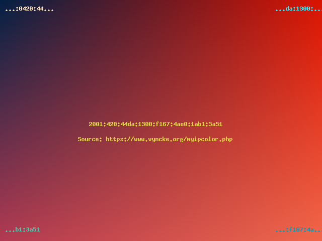 Had you selected a modern Internet Service Provider, then with your modern IPv6 address you would have seen a colorful picture... In general, the top half of the image will never change from the same network location (it is linked to your Internet Service Provider's prefix) but the bottom part can change daily (especially when using IPv6 privacy extensions).
