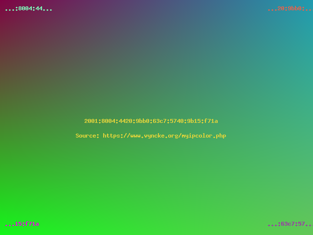 Had you selected a modern Internet Service Provider, then with your modern IPv6 address you would have seen a colorful picture... In general, the top half of the image will never change from the same network location (it is linked to your Internet Service Provider's prefix) but the bottom part can change daily (especially when using IPv6 privacy extensions).