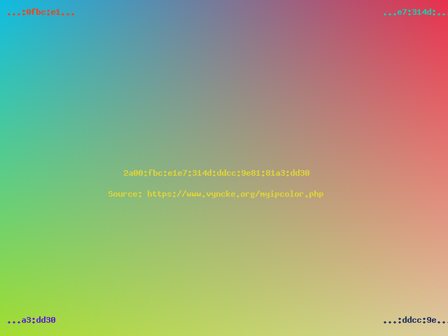 Had you selected a modern Internet Service Provider, then with your modern IPv6 address you would have seen a colorful picture... In general, the top half of the image will never change from the same network location (it is linked to your Internet Service Provider's prefix) but the bottom part can change daily (especially when using IPv6 privacy extensions).