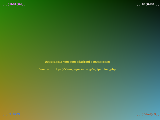 Had you selected a modern Internet Service Provider, then with your modern IPv6 address you would have seen a colorful picture... In general, the top half of the image will never change from the same network location (it is linked to your Internet Service Provider's prefix) but the bottom part can change daily (especially when using IPv6 privacy extensions).
