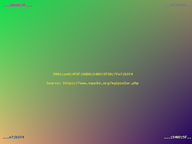 Had you selected a modern Internet Service Provider, then with your modern IPv6 address you would have seen a colorful picture... In general, the top half of the image will never change from the same network location (it is linked to your Internet Service Provider's prefix) but the bottom part can change daily (especially when using IPv6 privacy extensions).