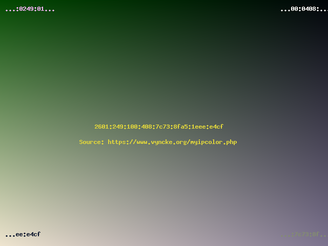 Had you selected a modern Internet Service Provider, then with your modern IPv6 address you would have seen a colorful picture... In general, the top half of the image will never change from the same network location (it is linked to your Internet Service Provider's prefix) but the bottom part can change daily (especially when using IPv6 privacy extensions).