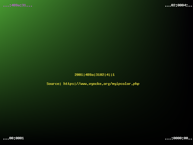 Had you selected a modern Internet Service Provider, then with your modern IPv6 address you would have seen a colorful picture... In general, the top half of the image will never change from the same network location (it is linked to your Internet Service Provider's prefix) but the bottom part can change daily (especially when using IPv6 privacy extensions).