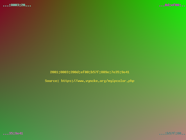 Had you selected a modern Internet Service Provider, then with your modern IPv6 address you would have seen a colorful picture... In general, the top half of the image will never change from the same network location (it is linked to your Internet Service Provider's prefix) but the bottom part can change daily (especially when using IPv6 privacy extensions).