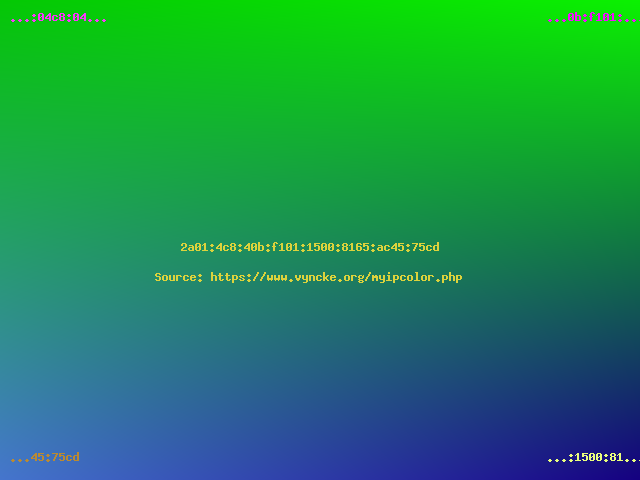Had you selected a modern Internet Service Provider, then with your modern IPv6 address you would have seen a colorful picture... In general, the top half of the image will never change from the same network location (it is linked to your Internet Service Provider's prefix) but the bottom part can change daily (especially when using IPv6 privacy extensions).