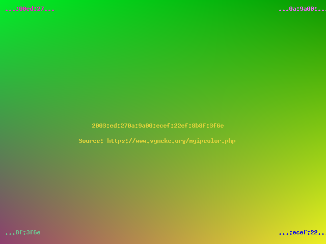 Had you selected a modern Internet Service Provider, then with your modern IPv6 address you would have seen a colorful picture... In general, the top half of the image will never change from the same network location (it is linked to your Internet Service Provider's prefix) but the bottom part can change daily (especially when using IPv6 privacy extensions).
