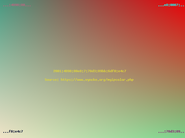 Had you selected a modern Internet Service Provider, then with your modern IPv6 address you would have seen a colorful picture... In general, the top half of the image will never change from the same network location (it is linked to your Internet Service Provider's prefix) but the bottom part can change daily (especially when using IPv6 privacy extensions).