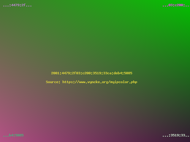 Had you selected a modern Internet Service Provider, then with your modern IPv6 address you would have seen a colorful picture... In general, the top half of the image will never change from the same network location (it is linked to your Internet Service Provider's prefix) but the bottom part can change daily (especially when using IPv6 privacy extensions).