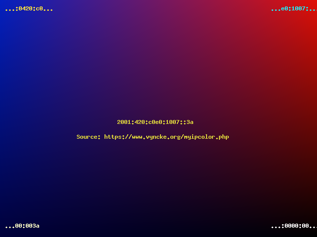Had you selected a modern Internet Service Provider, then with your modern IPv6 address you would have seen a colorful picture... In general, the top half of the image will never change from the same network location (it is linked to your Internet Service Provider's prefix) but the bottom part can change daily (especially when using IPv6 privacy extensions).