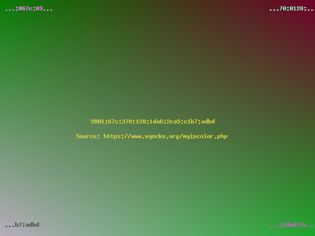 Had you selected a modern Internet Service Provider, then with your modern IPv6 address you would have seen a colorful picture... In general, the top half of the image will never change from the same network location (it is linked to your Internet Service Provider's prefix) but the bottom part can change daily (especially when using IPv6 privacy extensions).