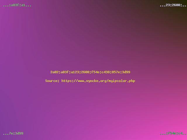 Had you selected a modern Internet Service Provider, then with your modern IPv6 address you would have seen a colorful picture... In general, the top half of the image will never change from the same network location (it is linked to your Internet Service Provider's prefix) but the bottom part can change daily (especially when using IPv6 privacy extensions).